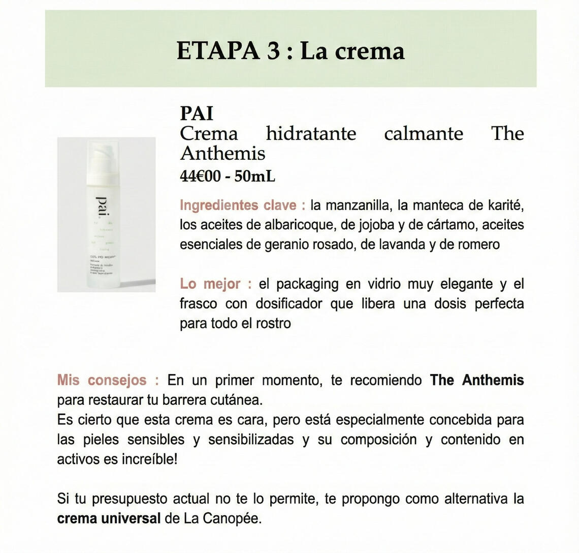 Si eliges la fórmula La Minimalista o La Esencial, te propondré 1 crema, 1 sérum, ! champú... Es 1 recomendación por tipo de producto.Si eliges la fórmula La Generosa o La Abundante, te propondré 3 cremas, 3 sérums, 3 champús... Son 3 recomendaciones por tipo de producto. Así, podrás elegir libremente entre estos 3 productos, según tus preferencias o lo que encuentras más fácilmente. Sin embargo, siempre añadiré consejos y las diferencias entre las 3 recomendaciones, además de mi opinión en función de tu situación.